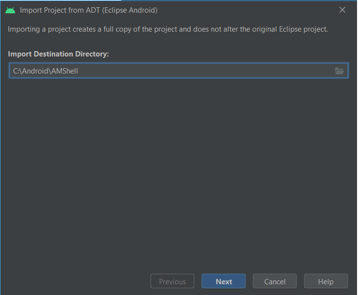 Перед вами отобразится первый экран импорта, на котором нужно будет указать путь к папке, где будет храниться сконвертированный проект (в моем случае, это папка AMShell).