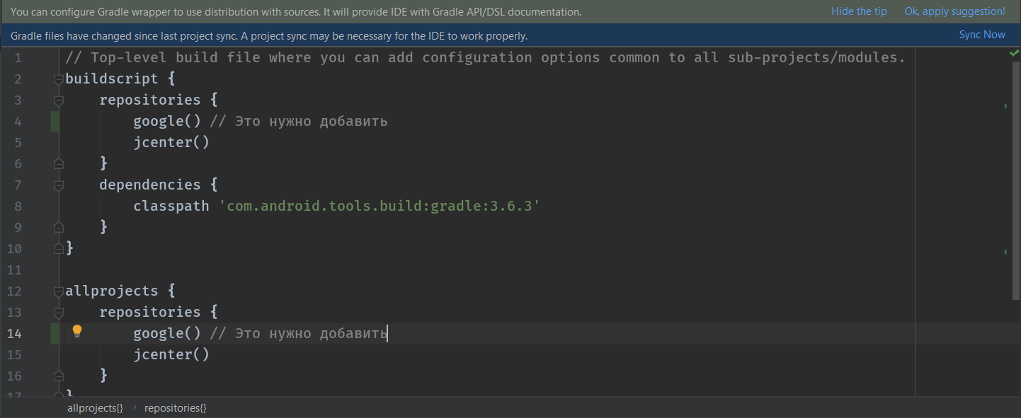Нажмите "Sync Now" и дождитесь, пока Gradle внесёт изменения.