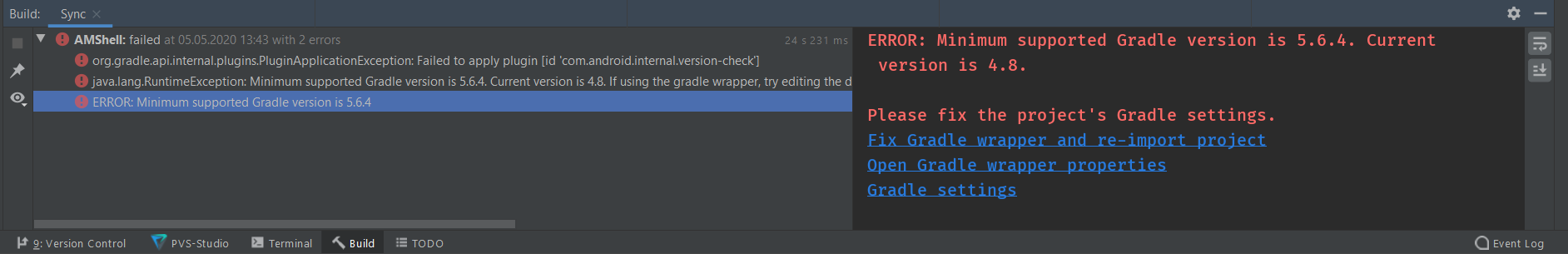 Для её исправления выделите третью ошибку и нажмите на "Fix Gradle wrapper and re-import project"