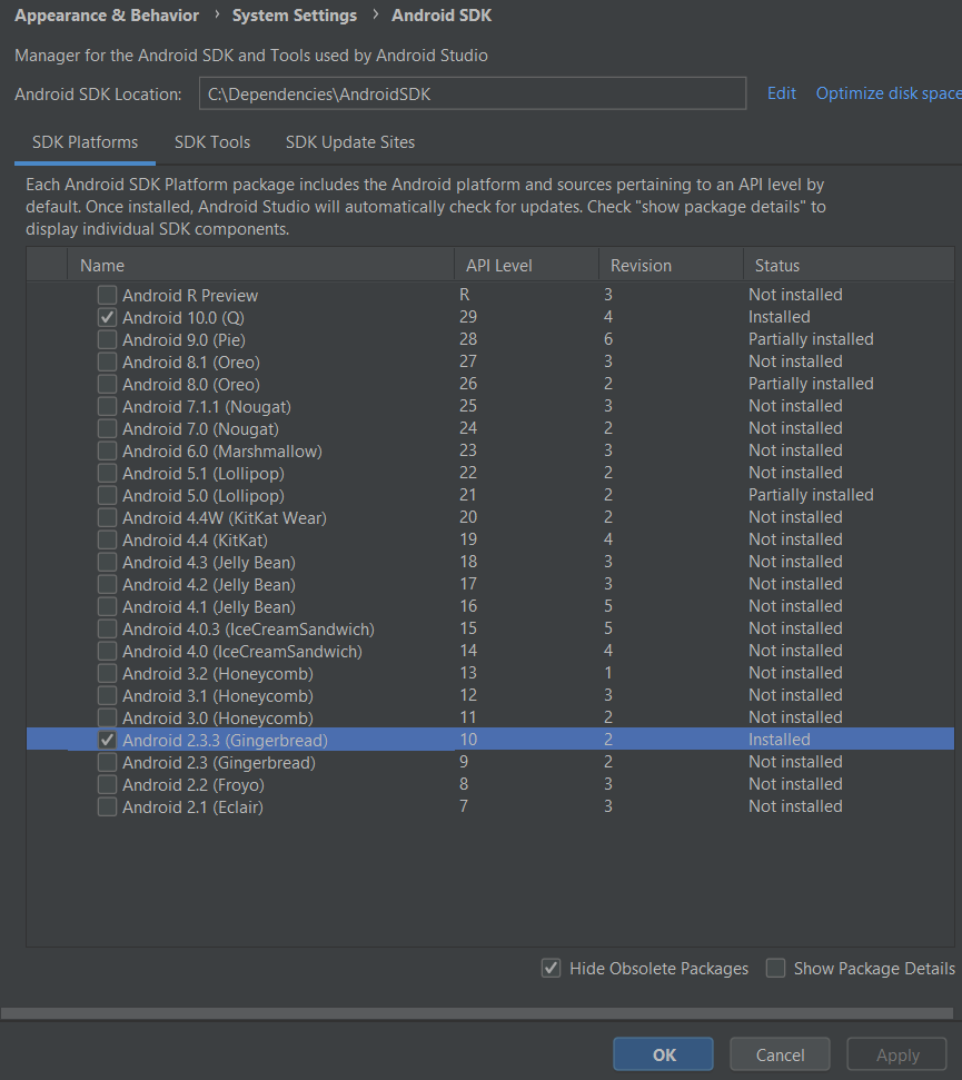 Если нет, поставьте напротив него галочку и нажмите "apply". Без установленного SDK дальнейшие действия бессмысленные и при сборке AndroidStudio будет выдавать ошибку!